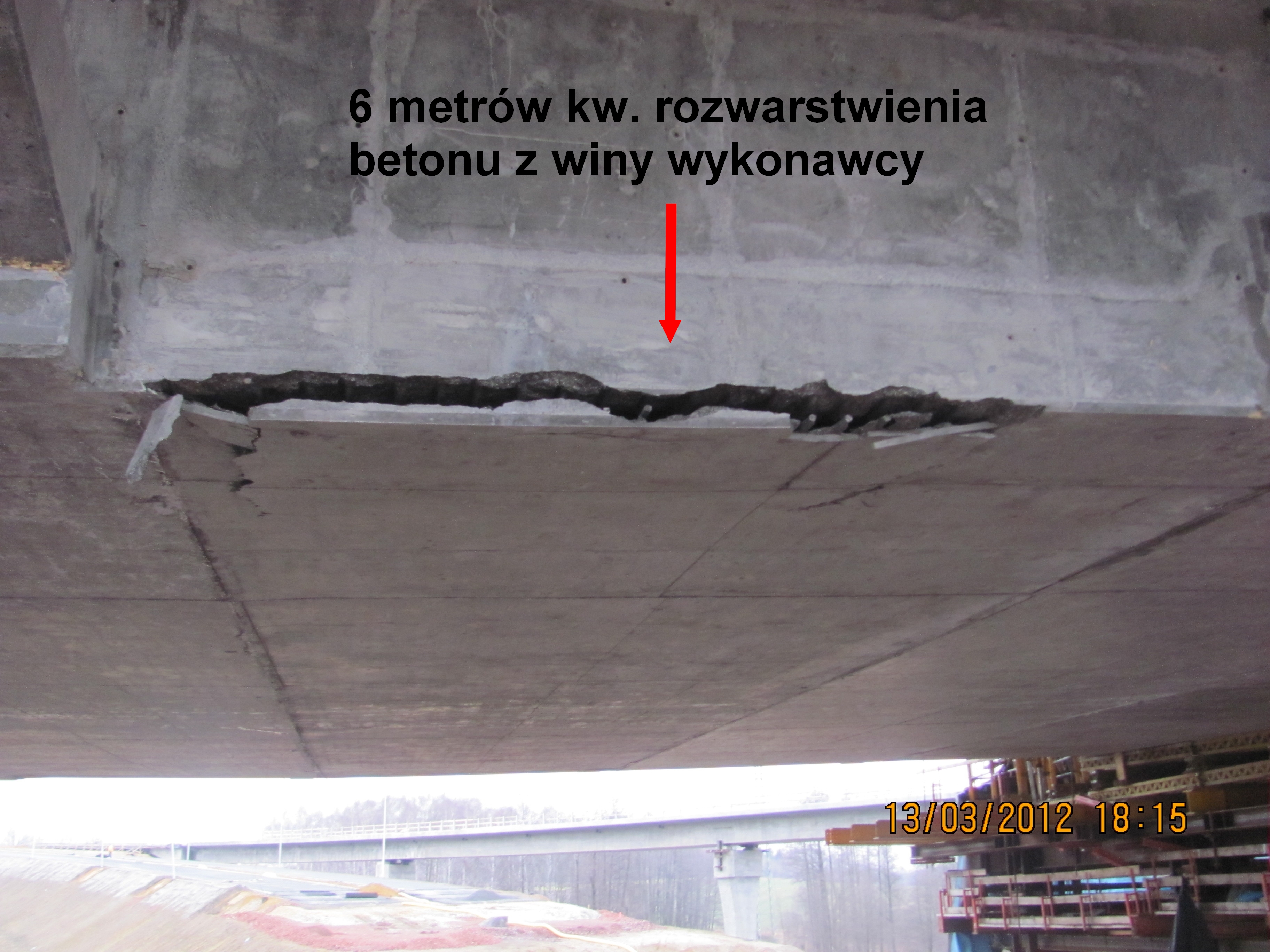 Jak wyraźnie widać na opublikowanym przez nas zdjęciu na małym fragmencie (6 m2) powierzchni mostu oderwały się betonowe fragmenty (całkowita powierzchnia mostu to ponad 14 tysięcy m2). Według opinii projektanta sporządzonej po oględzinach przeprowadzonych w obecności pracowników Alpine Bau oraz przedstawiciela Inżyniera Kontraktu, było to wynikiem ewidentnych błędów wykonawcy, tj. nieprawidłowego ułożenia osłonek pod kable sprężające. Są to błędy, dla których opracowywany jest obecnie przez wykonawcę program naprawczy. Wykonawca został przez GDDKiA zobowiązany do usunięcia własnych błędów. W żadnym razie nie wpływają one jednak na bezpieczne użytkowanie mostu i z pewnością nie powinny wstrzymywać budowy.