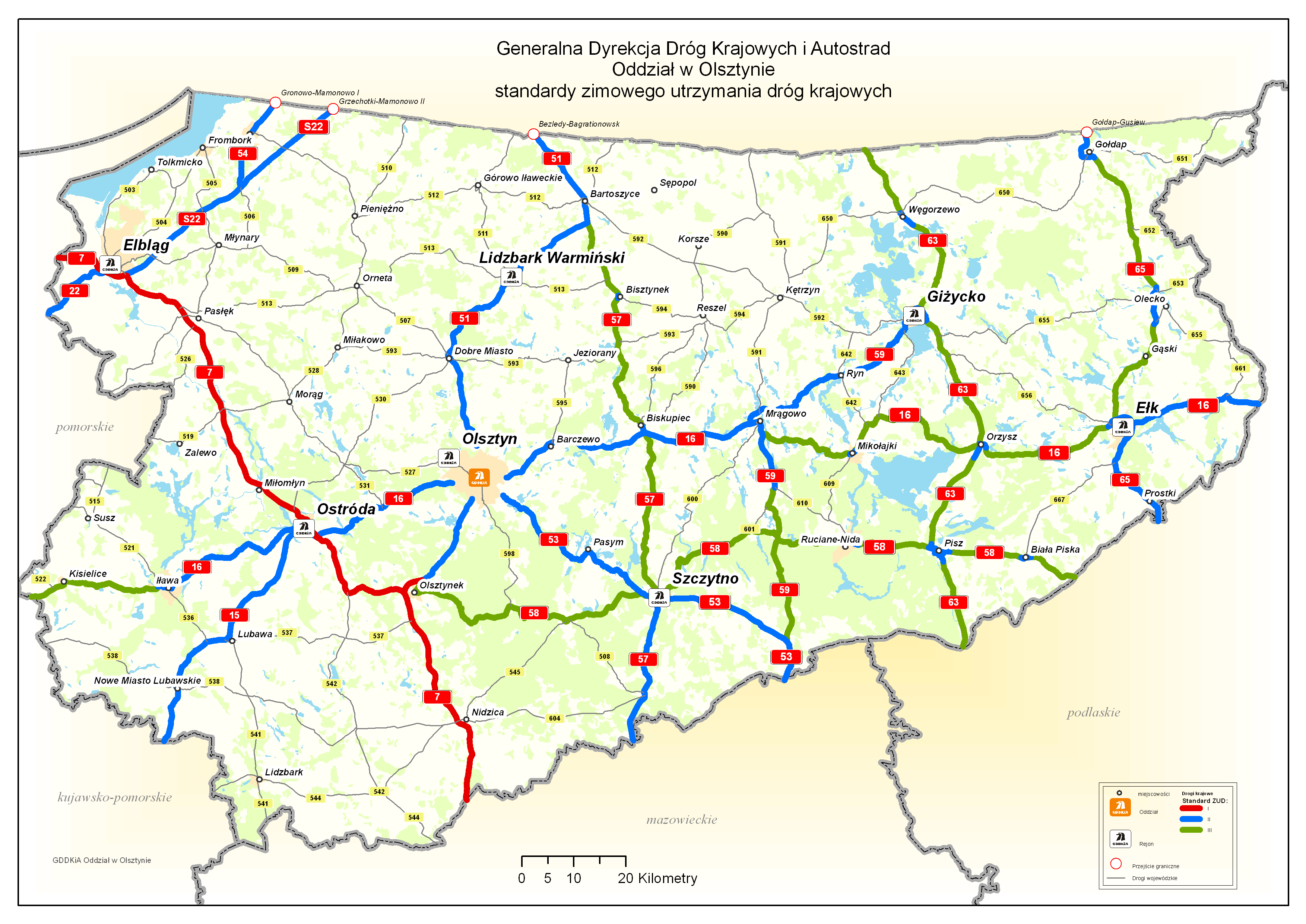 Do akcji zimowego utrzymania dróg krajowych w województwie warmińsko-mazurskim przygotowane są 259 jednostki sprzętu, w tym: 152 pługów lemieszowych, 17 pługów wirnikowych, 61 solarek, 29 piaskarki. W tej chwili w magazynach w województwie warmińsko-mazurskim znajduje się ok. 13 tys. ton soli oraz 5 tys. ton innych materiałów zapewniających szorstkość jezdni zimą. Wzdłuż dróg krajowych ustawiliśmy ok. 90 km zasłon przeciwśnieżnych.