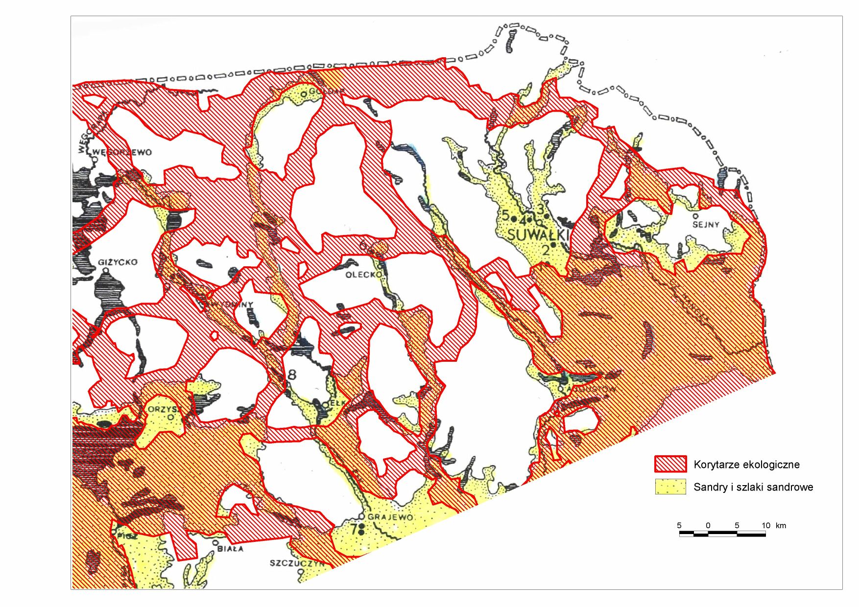 Szczególnie dobrze widać to na przykładzie Puszczy Augustowskiej, którą z terenami na północy łączy wiele naturalnych korytarzy o kierunku generalnie N-S, są to głębokie obniżenia rynnowe z ciągami jezior, połączonymi ciekami, z licznymi łęgami, zbiorowiskami zaroślowymi, szuwarami na podłożu torfowym. Są to prawdziwe, najbardziej uniwersalne korytarze ekologiczne, z których od tysięcy lat korzysta większość grup systematycznych zwierząt. Korytarze te nie są tylko łącznikami pomiędzy większymi kompleksami leśnymi, ale zachowują swoją funkcję również w ich obrębie. W tym kontekście niezrozumiałe jest pominięcie ważnego korytarza, jaki tworzy dolina Czarnej Hańczy z doliną Szeszupy, niekonsekwentny przebieg korytarza doliny Rospudy, który zaczyna się praktycznie na skraju Puszczy Rominckiej. Korytarz wyznaczony przez Jędrzejewskiego, biegnący równolegle do granicy państwowej na północ od Sejn i Suwałk przecina wszystkie możliwe naturalne korytarze ekologiczne z jeziorami i rzekami, biegnące północ-południe (Czarna, Marycha).