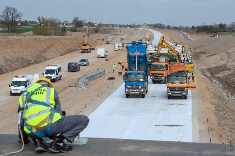 Z takiego tymczasowego rozwiązania kierowcy będą do czasu zakończenia prac na kolejnym odcinku do granicy z woj. mazowieckim. Jego długość to ok. 20,2 km a wykonawcą jest firma PORR. Decyzję ZRID dla tego odcinka uzyskaliśmy w marcu 2017 roku, a plac budowy przekazaliśmy w następnym miesiącu. Obecne zaawansowanie rzeczowe to ok. 76 proc. Wykonano już blisko połowę nawierzchni betonowej na ciągu głównym (łączna powierzchnia ok. 362,2 tys. mkw) i prowadzone są również prace przy układaniu nawierzchni bitumicznej na ciągu głównym. Wykonawca przygotowuje kolejne odcinki podbudowy pod właściwą nawierzchnię, prowadzi prace ziemne przy obiektach inżynierskich i prace wykończeniowe na nich. Budowane są przyszłe miejsca obsługi podróżnych i obwód utrzymania drogi.