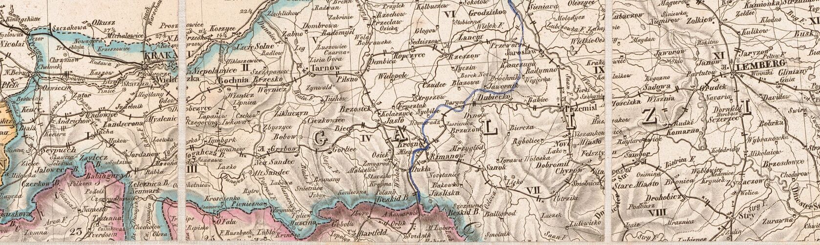 Wycinek mapy monarchii austriackiej z 1854 r., znajdującej się w zbiorach Biblioteki Kongresu USA, na której można prześledzić przebieg traktu środkowogalicyjskiego Link