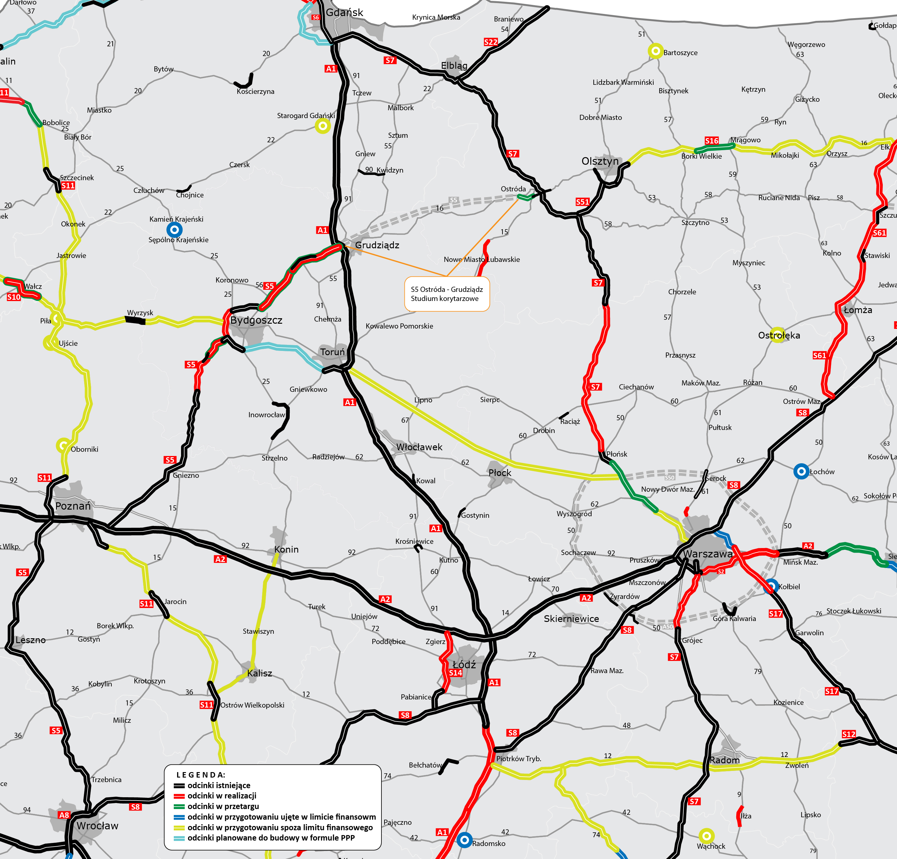 W połowie 2019 r. podjęliśmy prace planistyczno-studialne nad przyszłym, możliwym przebiegiem S5 na odcinku Ostróda – autostrada A1. Jesteśmy w trakcie opracowywania studium korytarzowego, podstawowego dokumentu projektowego, kompleksowo przedstawiającego drogowe zamierzenie inwestycyjne. Studium korytarzowe obejmuje pas drogowy o szerokości ok. 5 km, natomiast obszar ujęty w studium to powierzchna ponad 8 tys. km² na terenie trzech województw, 14 powiatów i 53 gmin. Analizujemy potencjalne przebiegi tras w relacji z obszarami o różnych funkcjach przestrzennych, w tym objętych ochroną (środowisko przyrodnicze, zabytki, struktura osiedleńcza, budowa geologiczna itp.) z uwzględnieniem istniejącego planowanego zagospodarowania przestrzennego. Przeprowadzone analizy interdyscyplinarne pozwalają wszechstronnie ocenić porównywane trasy drogowe, jak i zaproponować optymalny przebieg studiowanej trasy drogowej, która będzie przedmiotem szczegółowych analiz na kolejnych etapach przygotowania inwestycji.