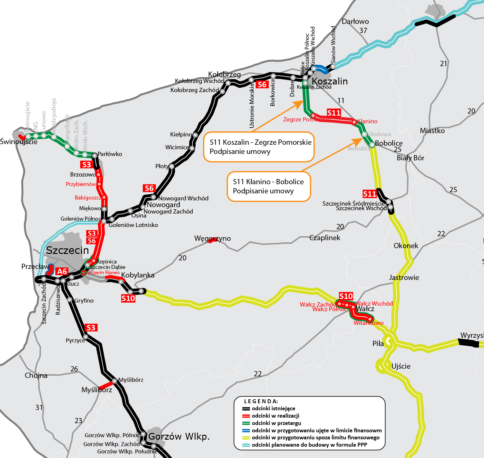 Droga S11 łączy bezpośrednio Pomorze Środkowe ze Śląskiem przez Wielkopolskę. Dotychczas na drodze S11 były realizowane głównie obwodnice miejscowości. W ubiegłym roku do ruchu została oddana obwodnica Szczecinka, trwa realizacja obwodnicy Olesna i Kępna. Odcinek Koszalin - Bobolice, który został podzielony na trzy odcinki realizacyjne, to pierwszy fragment szlakowy drogi S11, który wkracza w etap realizacji. Dla pozostałych odcinków S11 trwa proces przygotowawczy.