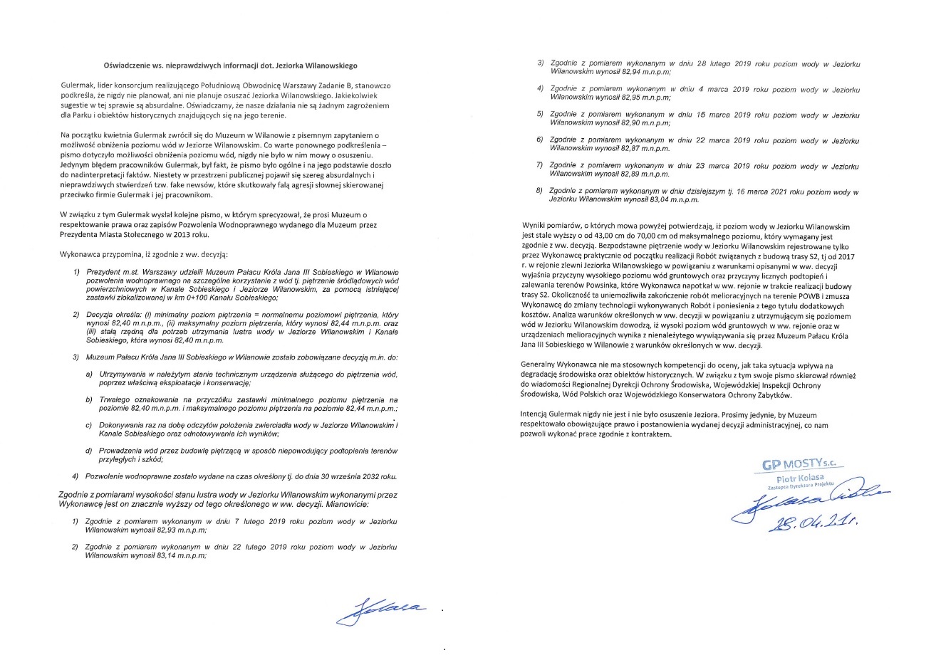 Ponadto informujemy, że inwestycja jest zrealizowana w oparciu o przepisy prawa a także zgodnie z pozyskanymi decyzjami. Każda jednostka otrzymując decyzję, powinna wypełniać nałożone w niej obowiązki. Dotyczy to również Muzeum w Wilanowie, które posiada pozwolenie wodnoprawne wydane przez Wody Polskie w 2013 r. na szczególne korzystanie z wód Kanału Sobieskiego i Jeziora Wilanowskiego. Zgodnie z tą decyzją poziom zwierciadła wody nie powinien przekroczyć określonego poziomu oraz być stale monitorowany i odnotowywany. Pomiary wykonywane przez Gulermak wskazują, że wysokość lustra wody jest znacznie wyższa niż określa to pozwolenie wodnoprawne. Taki stan rzeczy uniemożliwia wykonawcy S2 dokończenie robót melioracyjnych.