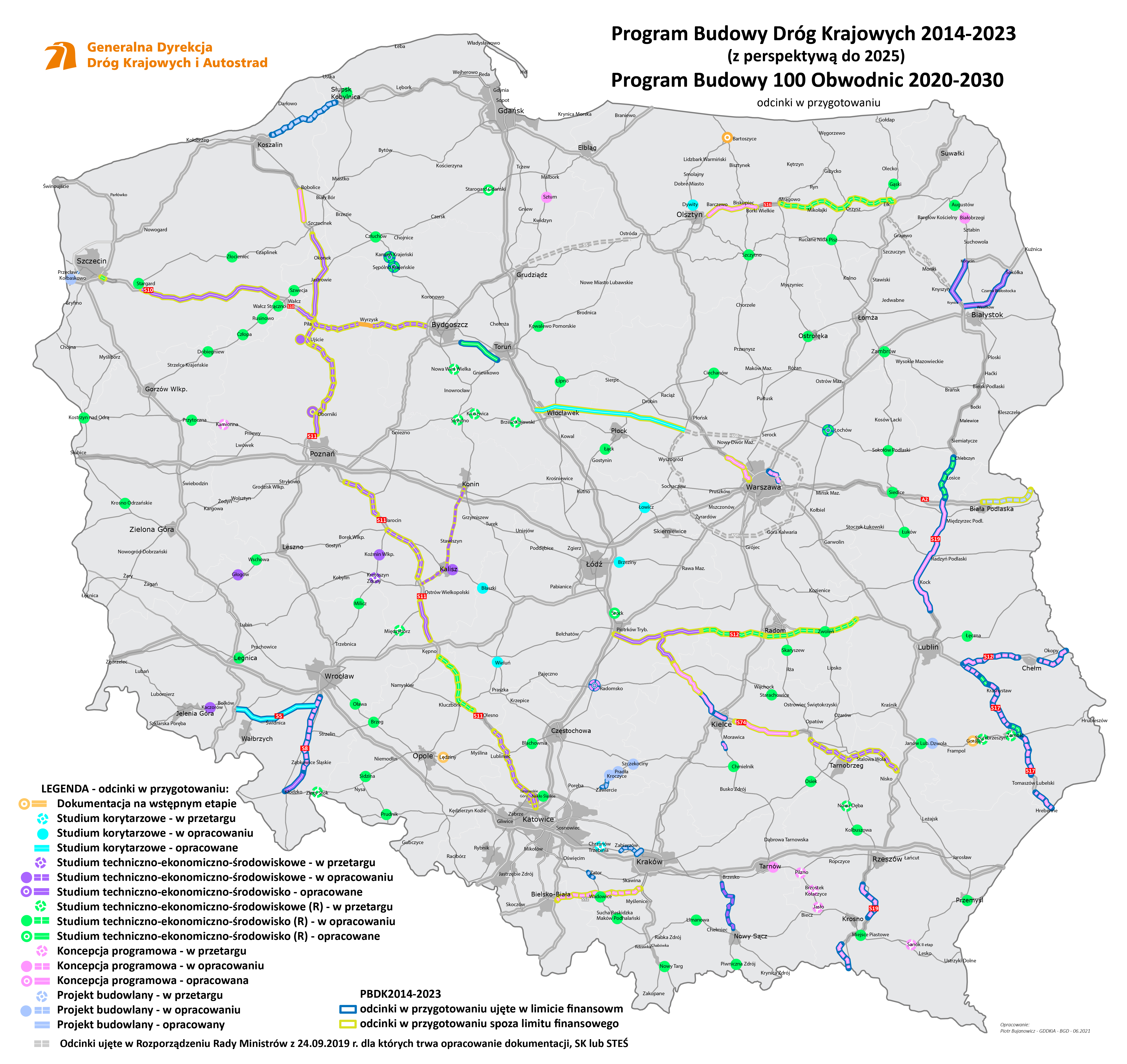 Obecnie na etapie przygotowania jest 101 zadań o łącznej długości blisko 2060 km z Programu Budowy Dróg Krajowych (PBDK) oraz 86 obwodnic z Programu budowy 100 obwodnic (PB100) o łącznej długości ok. 747 km.